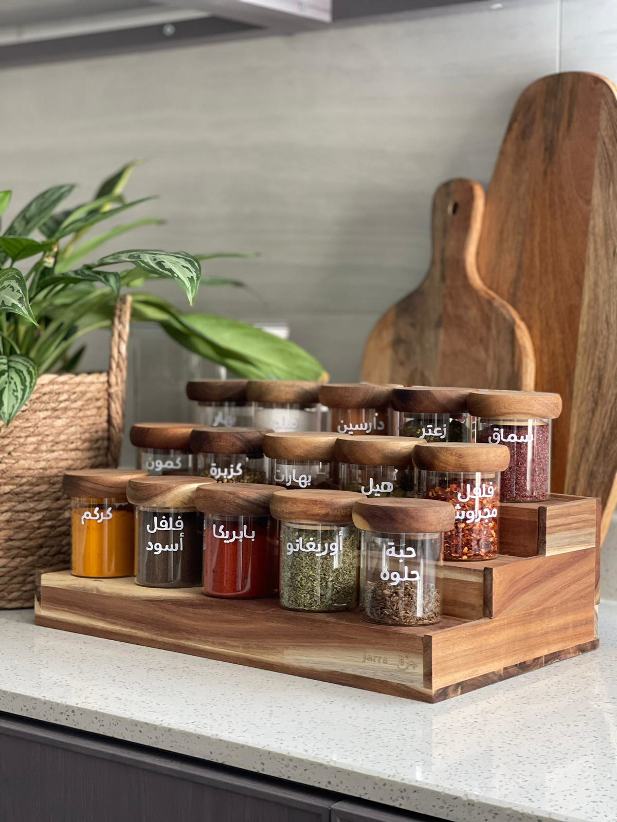 - حامل جرات خشبي من 3 أدوار مع 15 جرة 200 ملي - طقم خشب الأكاسيا الطبيعي