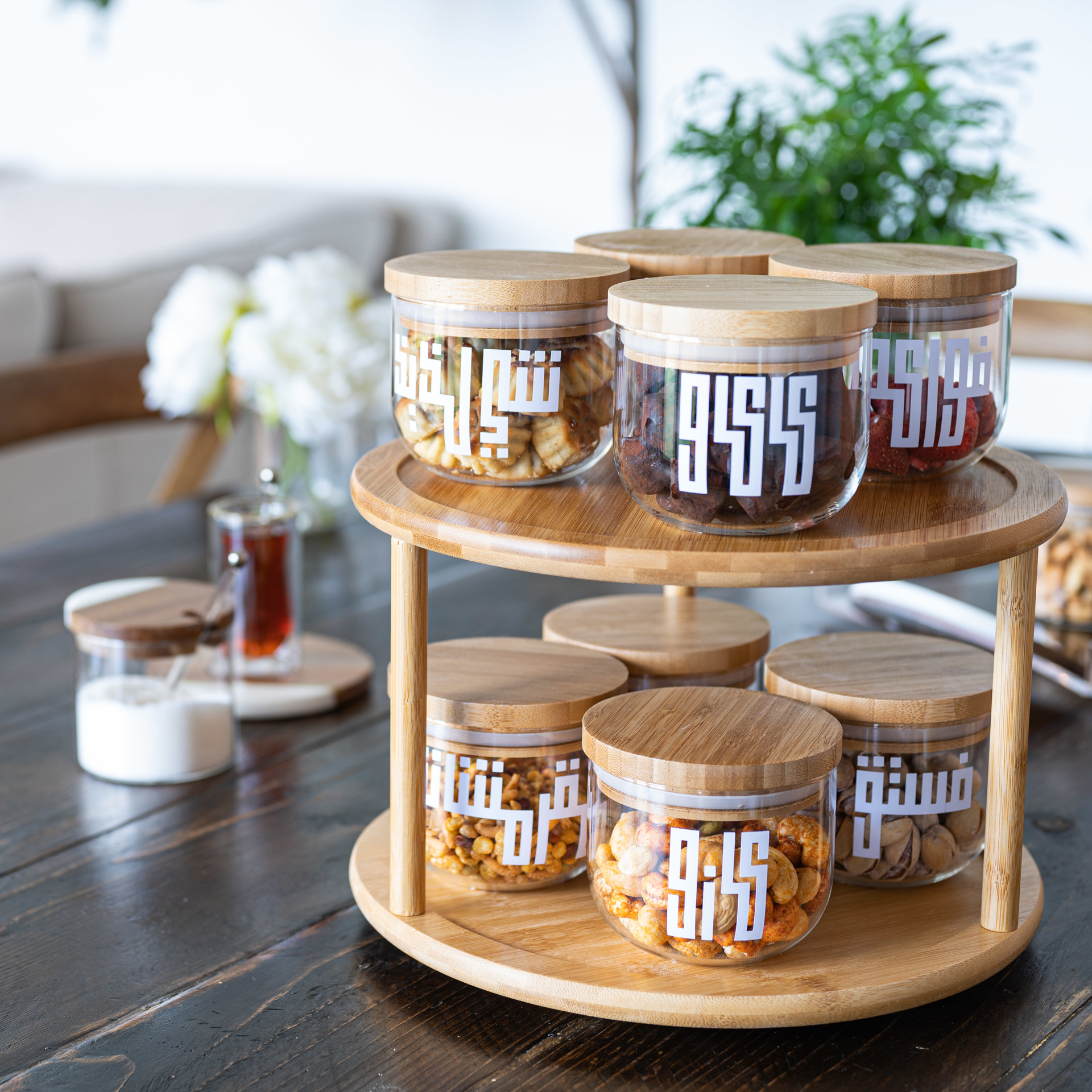 قاعدة من خشب البامبو لثلاثة علب