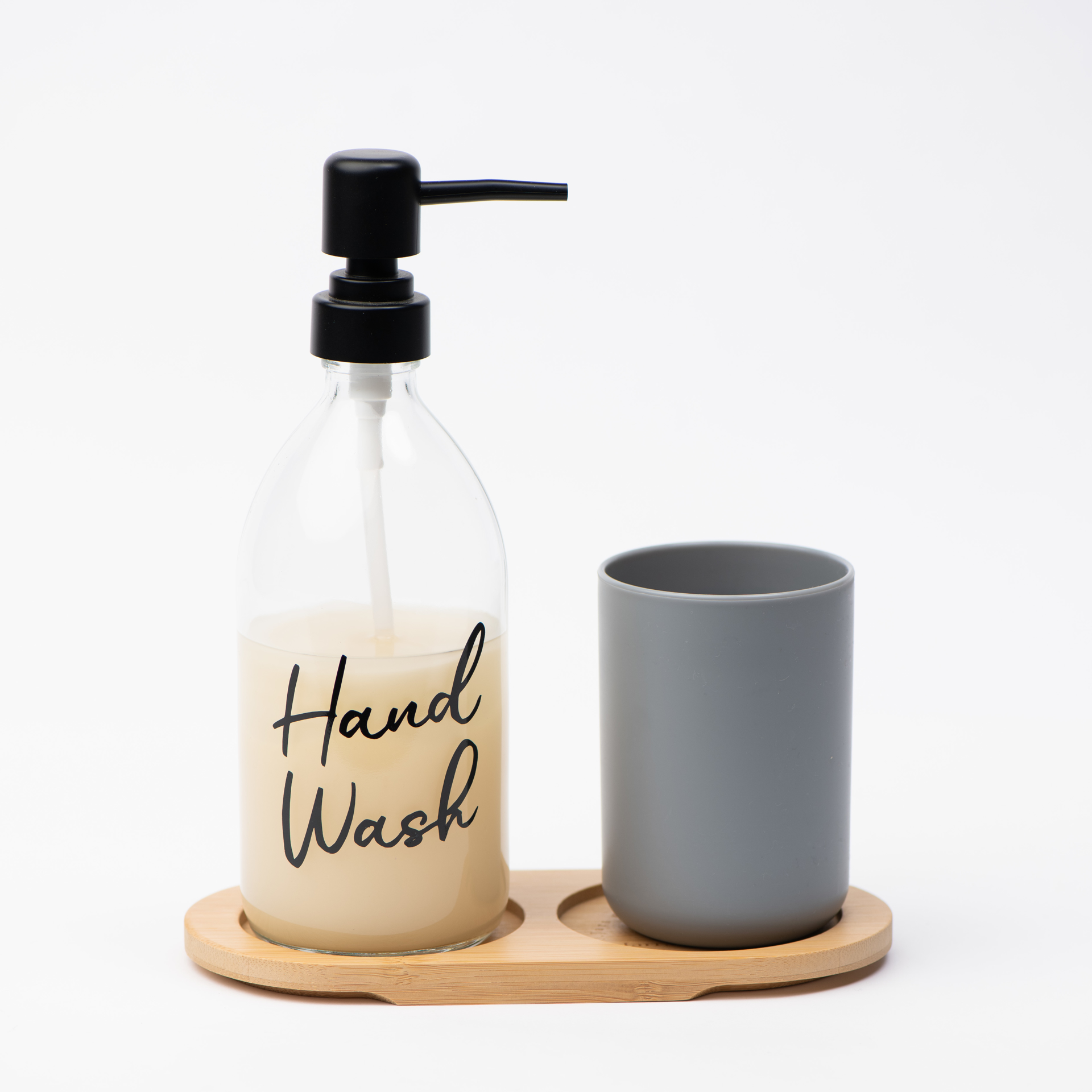 شامل الكتابة.. قياسات موزع الصابون: الطول = 17 سم، العرض = 5.5 سم.. قياسات الكوب: الطول = 10.5 سم، العرض = 7 سم.. قياسات الصينية: العمق = 9.5 سم، العرض = 20 سم.. عمق الحامل: 8 سم