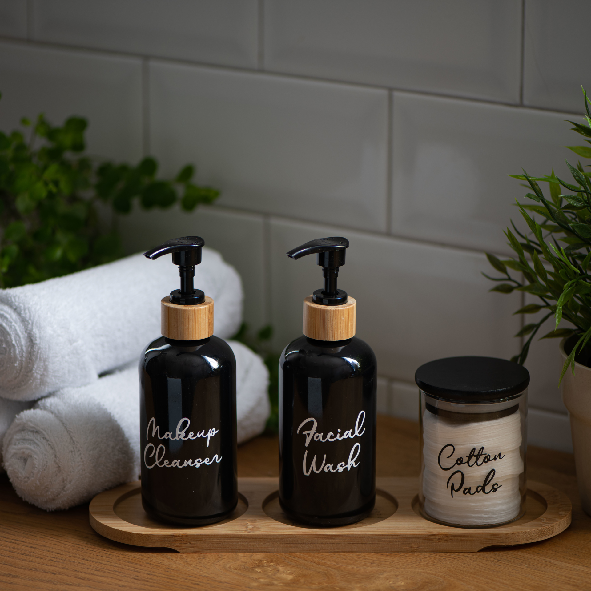 Black Two 250 ml dispensers: Length = 17 cm, Width = 5.5.. Black One 200 ml Jar: Length = 8 cm, Width = 6.5.. Tray Dimensions: Depth = 9.5 cm, Width = 29 cm Coaster Size: 8 cm