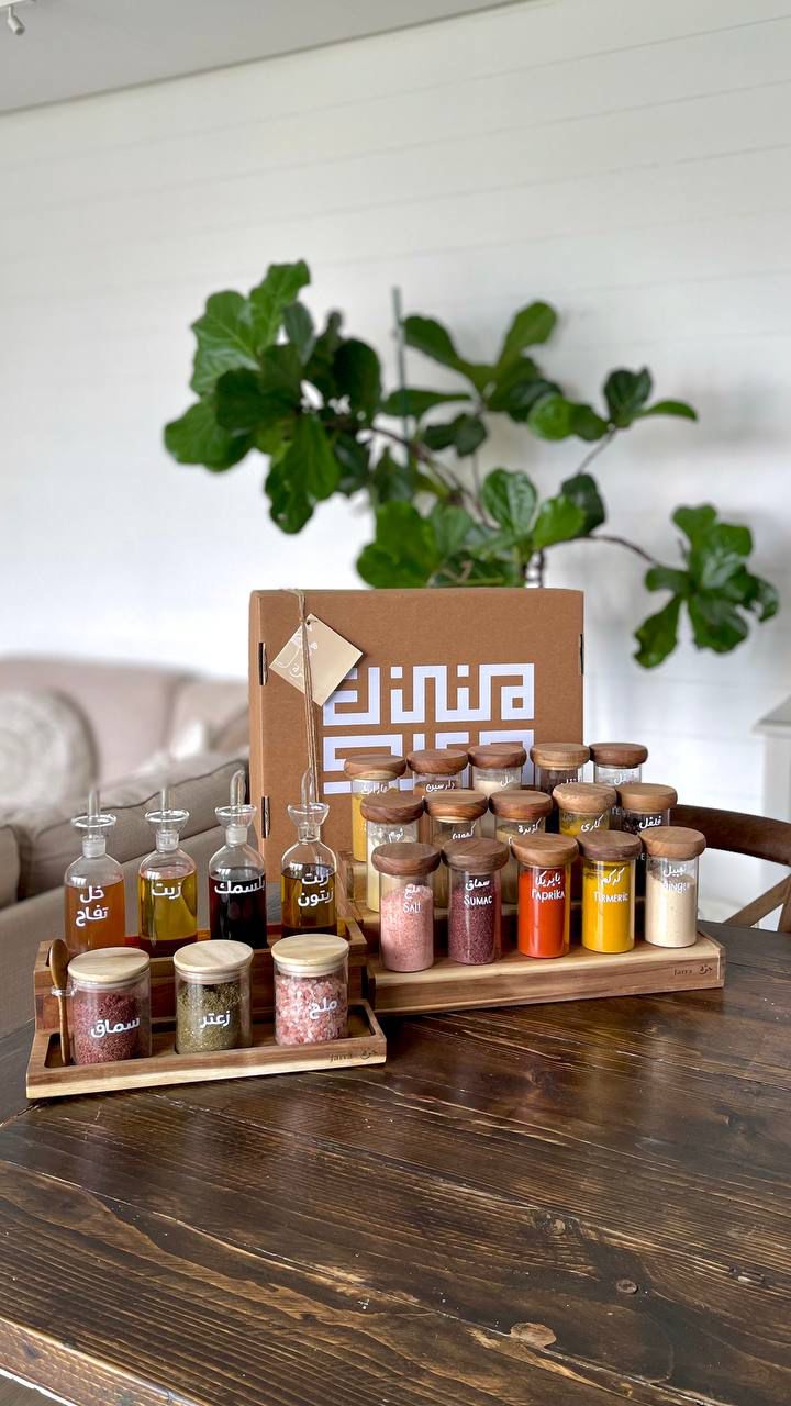 1 Acacia Wood Stand (L 36 cm - W 20.5 cm) 4 Oil bottle 500 ML (L 28 cm - W 6 cm) 2 Jars (L 11 cm - W 8 cm) 1 jar with spoon (L 11 cm - W 8 cm) 1 Metal Funnel for liquids and spices 1 Spices Stand 15 (300) Ml Jars